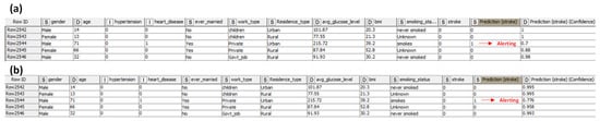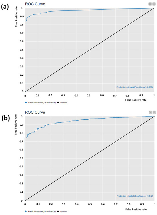 The dataset [18] is processed by the two algorithms RF and GBT. In Figure 6a,b, two screenshots are shown, indicating the stroke prediction of the same records by executing both the ML RF and GBT algorithms; the algorithms provide the same alerting condition with a weakly different confidence (0.7 in the case of RF and 0.776 for GBT). The algorithms provide similar prediction results and good performances (see performance parameters of Table 1). In Figure 7 can be seen the Receiver Operating Characteristic Curves (ROCs) of both the approaches, providing the values of the Area Under the ROC Curve (AUC) of Table 1, furthermore confirming the high algorithm performance. A further estimated performance index indicated in Table 1 is the F-measure (or F-score), measuring the predictive performance. The F-measure is typically adopted for statistical analysis of binary classification and information retrieval systems.