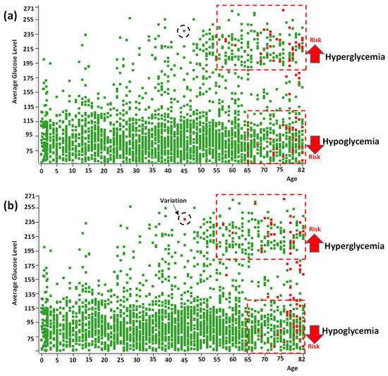 We observe that the results to pay attention to are those where the risk of stroke is predicted even though there has not been an alert condition in the past. In order to group the results, the RF and GBT outputs are clustered by the Fuzzy c-Means algorithm, highlighting in red the predicted risk cases of stroke (the red color indicates the cluster of the predicted stroke risk). By considering three clusters, it is observed that the predicted stroke cases do not appertain to the first cluster characterized by patients having an age lower than 40 years old (this allows for excluding the preventive monitoring of these patients). In Figure 8, a comparison is presented of RF and GBT risk cases due to hyperglycemia and hypoglycemia status, by confirming the results expected in the literature [14,15]. The results of both algorithms present few differences.