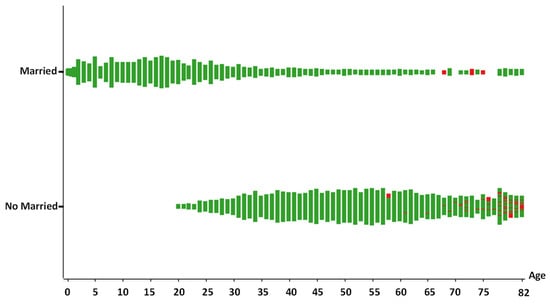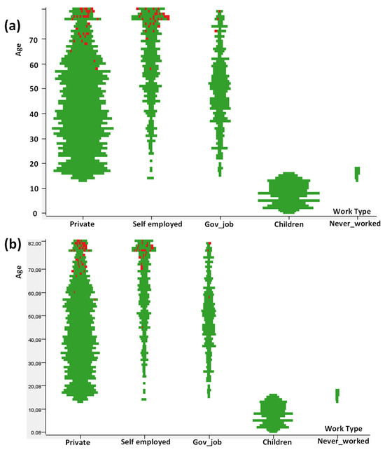 In Figure 9a,b, the RF and the GBT stroke risks are shown, matching patient age and patient work type, respectively. Also, in this case, both algorithms provide similar results by highlighting that private companies employees or managers are characterized by a high stroke risk. This result enhances the impact of the work about the stroke risk and could enable the formulation of new welfare policies in private work environments; according to the results, possible interventions could be applied regarding the optimization of working conditions, improving the quality of life, and consequently decreasing the health risk.