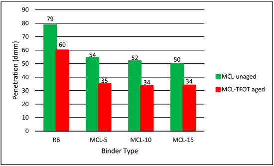 The needle penetration test was carried out at 25 °C in accordance with EN 1426 [16]. Figure 3 and Figure 4 indicate that the addition of microchlorella and chlorella hardened the reference bitumen. Specifically, increasing contents of algae resulted in lower penetration values. It is noteworthy that even a small percentage of modification, as low as 5%, caused a change in category for the reference bitumen from 70/100 to 50/70, in accordance with the bitumen categories specified in EN 12591 [24]. The hardening effect was also displayed for the short-term aged algae-modified samples. Short-term aged samples demonstrated lower penetration values than their unaged counterparts due to the oxidation during the ageing process, which hardened the bitumen.