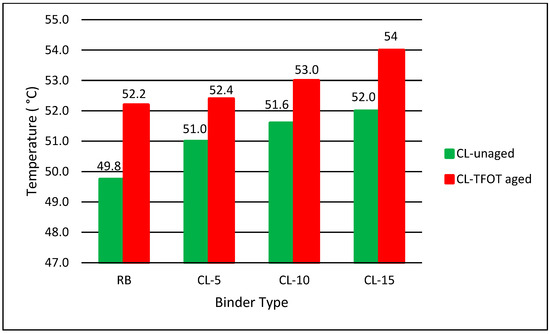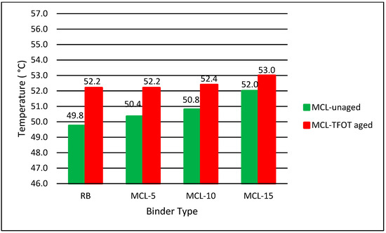 The softening point test was conducted with respect to EN 1427 [17]. Figure 5 and Figure 6 demonstrate the gradual increase in the softening point for increasing content in both the microchlorella-modified and chlorella-modified unaged binders. After short-term ageing, the chlorella-modified blends presented higher softening points than the short-term aged reference bitumen. The microchlorella-modified blends also displayed an increase in their softening point after short-term ageing compared to the reference bitumen, but the increment was less pronounced than that of the chlorella-modified blends. Moreover, all aged unmodified and bio-modified blends had higher softening points than their unaged counterparts. The highest resistance to ageing was demonstrated by MCL-15 for which the softening point increase after applying the ageing protocol was equal to only 1 °C (from 52 to 53 °C). This is expected to happen as ageing has a hardening effect on bitumen.