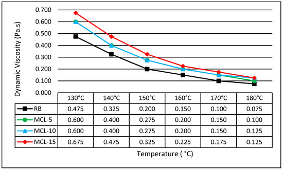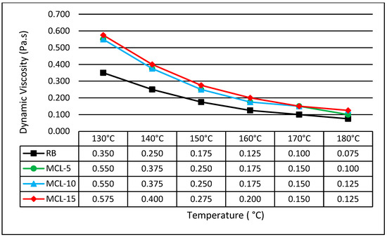 Dynamic viscosity of MCL-modified TFOT-aged blends.