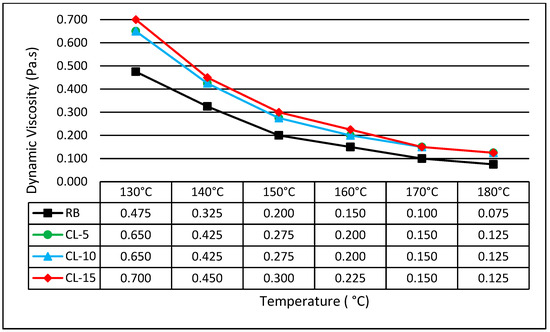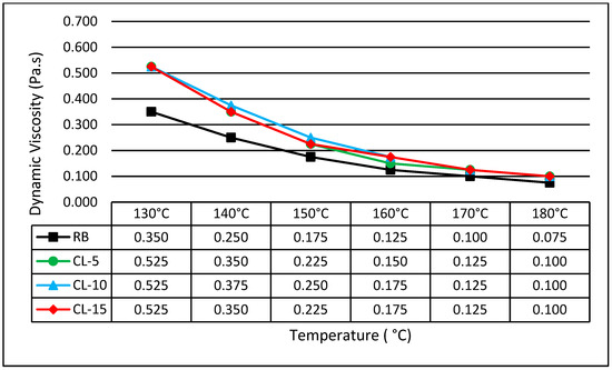 Dynamic viscosity of CL-modified TFOT-aged blends.