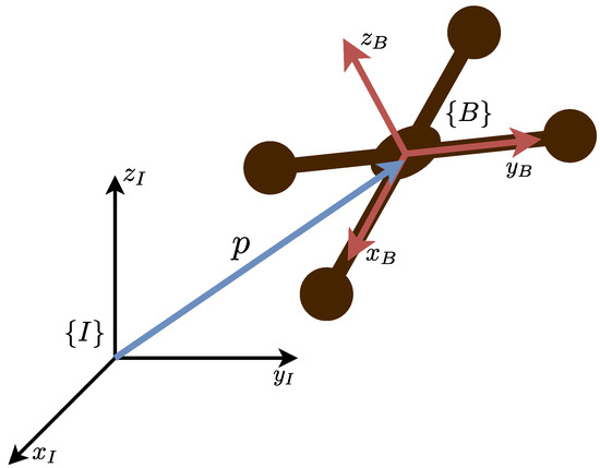 The rigid body state comprises a position in the inertial frame p, a velocity in the body frame v, an angular velocity in the body frame , and a rotation matrix R that represents the transformation between the fixed body frame and the inertial frame orientations. The full kinematics equations are: