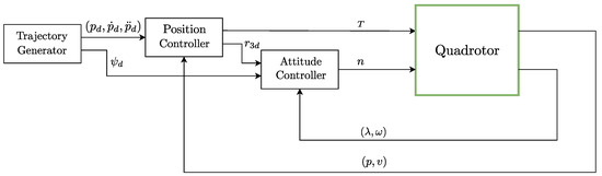 The trajectory generator block creates the references , , and for the position controller and the reference for the attitude controller. These signals represent the desired position and its derivatives and the desired angle, respectively. Besides generating an input thrust T, the position controller also generates a desired upwards orientation corresponding to the third column of R, which is combined with in the attitude controller to track the desired orientation angles.