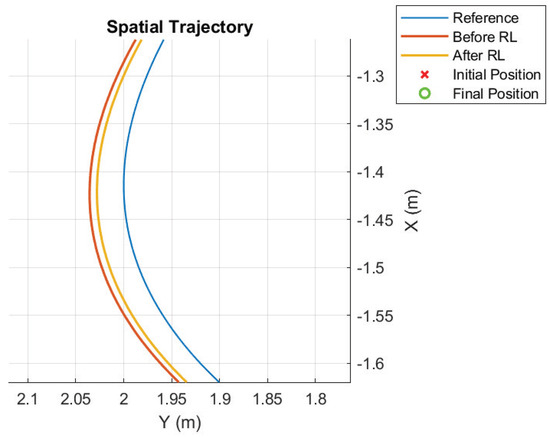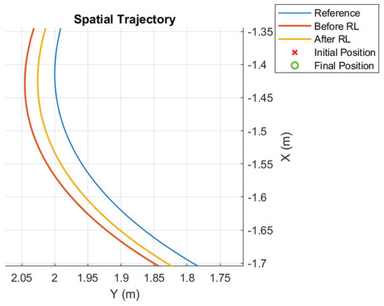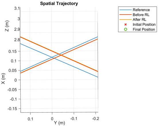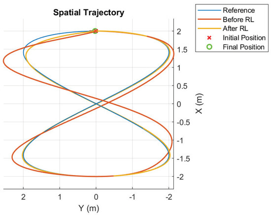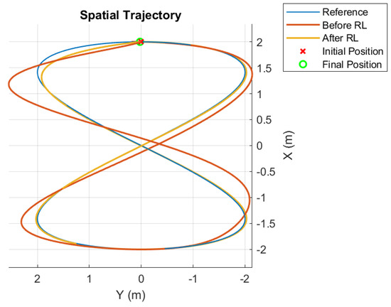 The score for the performance metric before the gains computed with RL are applied is 0.01781 and, after applying the algorithm, the score becomes 0.01765. In this case, the improvement is almost negligible. This can be seen in Figure 10, where both trajectories practically overlap each other, ending up having the same distance to the reference lemniscate curve.