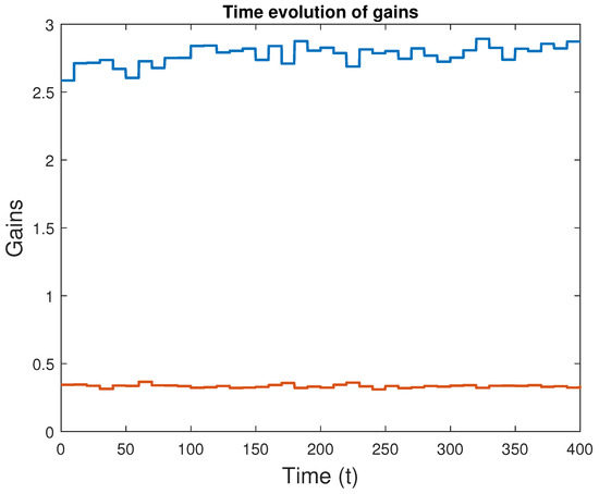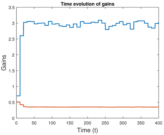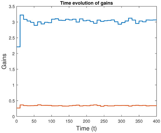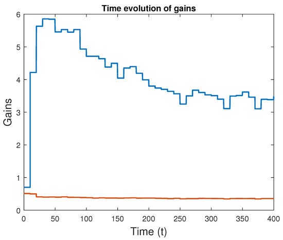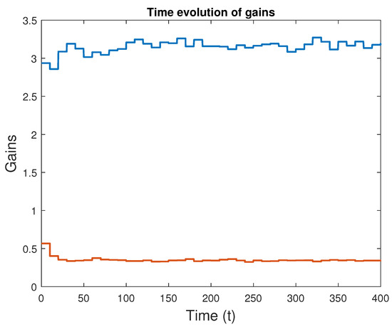 Evolution of the learned attitude controller gains with time (first case: dither covariance ); the blue line represents the first gain and the red the second gain.