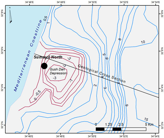 Location map of the study site over the Pleistocene Coastal Aquifer. This map includes 2018 water level contours as documented by the Hydrological Service of Israel [6]. The contours shaded in maroon indicate the Gush Dan Depression, a result of extensive aquifer exploitation.