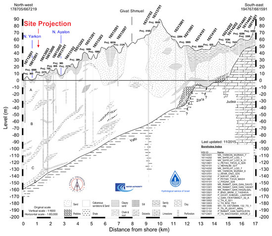 - Dvory, N.Z.; Elad, M.; Scheuer, N.; Zurieli, A.; Netzer, L.; Lifshitz, Y. Atlas of Geological Cross-Sections and Sub-Basin Maps for the Israeli Coastal Aquifer. 2014. Available online: https://www.researchgate.net/publication/364609385_Atlas_of_Geological_Cross-Sections_and_Sub-Basin_Maps_for_the_Israeli_Coastal_Aquifer (accessed on 1 March 2024).