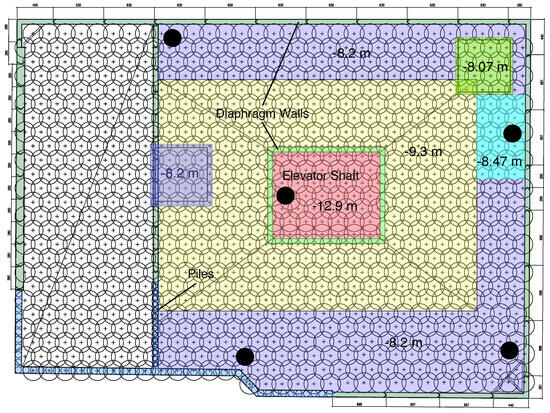 Design overview of diaphragm wall (green rectangles), piles (blue rectangles), jet grouting (crosses mark the jet drill location, and circles mark the engineered jet lateral distribution), and dewatering levels (colored and labeled: −8.07 m, −8.2 m, −8.47 m, −9.3 m, and −12.9 m). Note the elevator shaft enclosed by diaphragm walls (light green rectangles). Black dots indicate pumping wells. Injection wells, situated approximately 45 m northeast, are not depicted. The left-hand section of the project, unoperated during the study period, is not highlighted.
