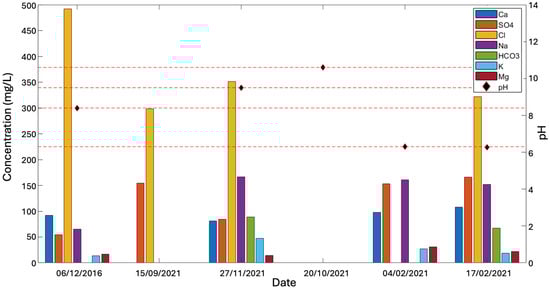 Additionally, changes in water hardness, as indicated by calcium (Ca) and magnesium (Mg) concentrations, provide complementary insights. In December 2016, the ion concentrations were approximately 92 mg/L and 17 mg/L, respectively, resulting in a water hardness value of 300 mg/L CaCO3. The significant shift towards alkaline conditions observed in November 2020 was accompanied by a noticeable decrease in calcium and magnesium concentrations compared to 2016, with 81 mg/L and 14.6 mg/L, respectively, yielding a water hardness value of 255 mg/L CaCO3. This indicates the limescale deposition process, which removes calcium and magnesium from the system. Subsequent measurements on 18 February 2021, showed average concentrations of approximately 108 mg/L for calcium and 22 mg/L for magnesium, resulting in a water hardness value of 306 mg/L CaCO3, closely resembling the preconstruction chemical pattern of the aquifer.