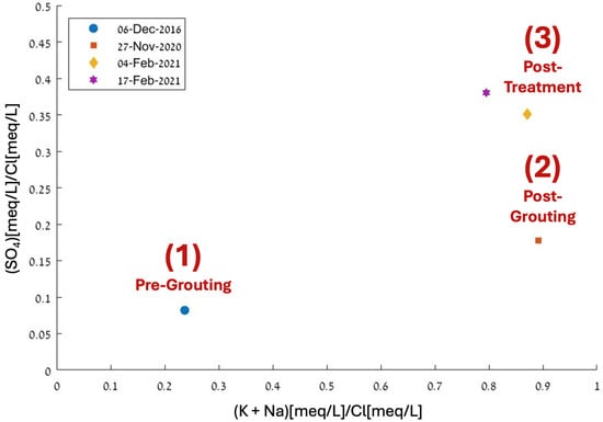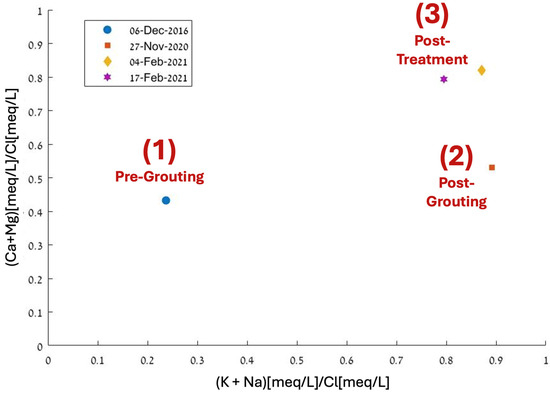 Figure 6 illustrates the groundwater geochemical evolution, with normalized calcium and magnesium concentrations in milliequivalents compared to sodium and potassium concentrations. This view suggests that the impact of sodium and potassium release on the system due to grouting application remains significant despite the acidic treatment, which also increased the availability of calcium and magnesium ions in the groundwater.