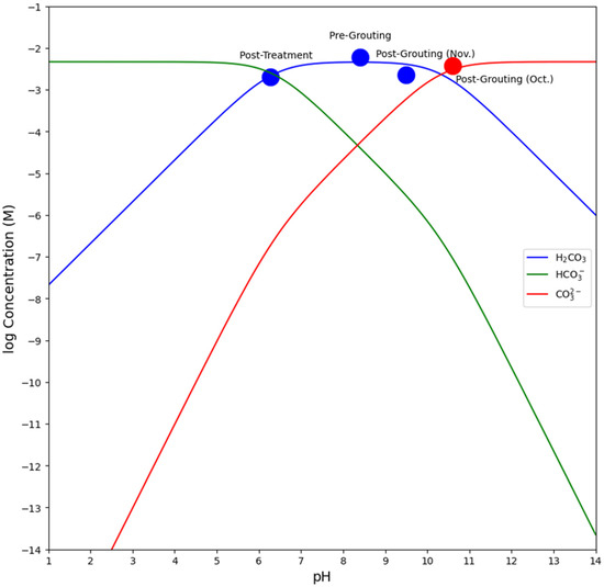 Figure 8 presents a speciation diagram, commonly referred to as a Bjerrum plot, illustrating the evolution of groundwater chemistry at the site. In December 2016, prior to grouting activities, the water exhibited a pH of 8.4, with calcium concentrations approximately 92 mg/L, equivalent to about 2.3 mM. Under these pH conditions, the dominant carbonate species was the bicarbonate ion (HCO3−), resulting in an alkalinity equal to twice the calcium concentration: