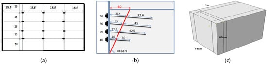 The helical bracing, the soil, and the guard structure make up the model’s three main components. In the experiment, three different types of helixes with lengths of 40, 60, and 70 cm were used. The rows were positioned in the soil at an angle of 10 degrees, with the bottom row being 40 cm long, the second row being 60 cm long, and the top two rows being 70 cm long. The soil in this model had the following measurements: 100 × 80 × 74 cm. Its geometry is shown in Figure 2c, and Table 3 lists the material properties of the soil.
