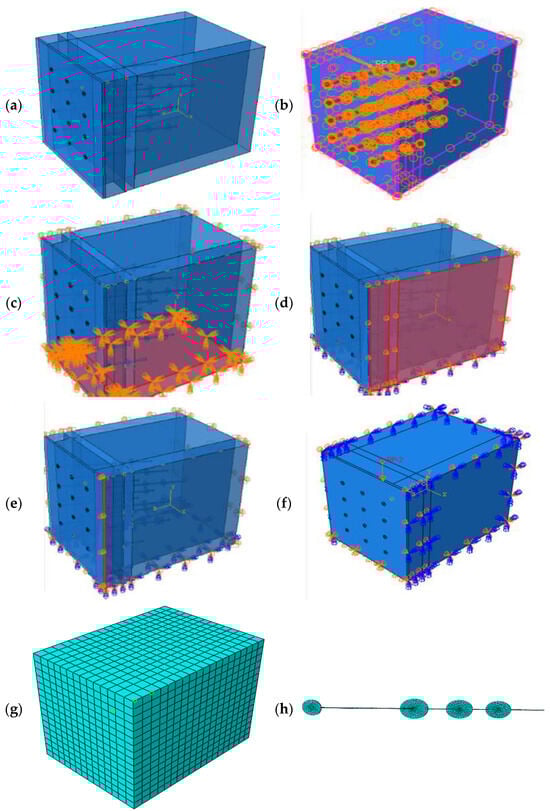 (a) Assembly model with helical anchor; (b) defining the model for burying the anchor in the soil; (c) complete binding of the lower part of the soil; (d) binding of the right wall in the structure; (e) binding the guard wall; (f) applying load on the upper part of the soil; (g) soil model meshing; (h) helical anchor meshing.