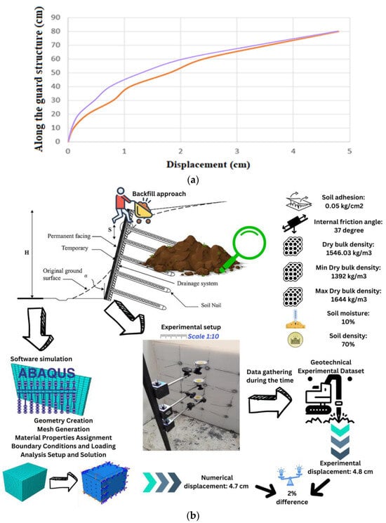The descriptions of (a) displacement along the wall from the Abaqus model in orange; displacement along the wall from the base in the physical model in purple; and (b) experimental setup specifications.