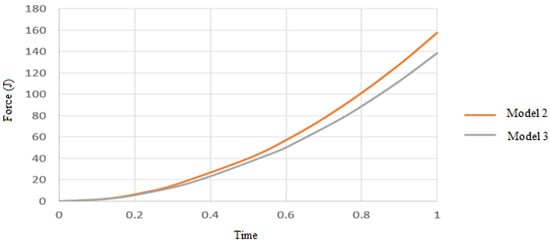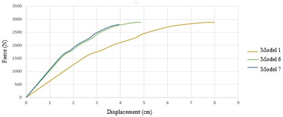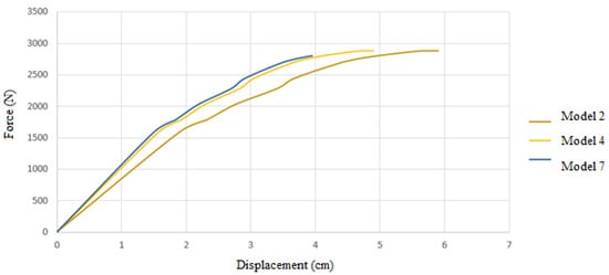 In Figure 6, the displacement of the applied force for each of the models can be seen until the end of the analysis.