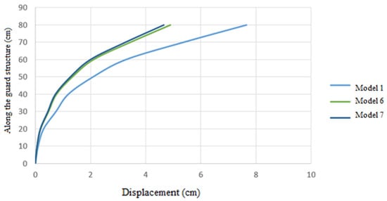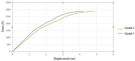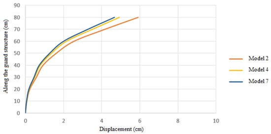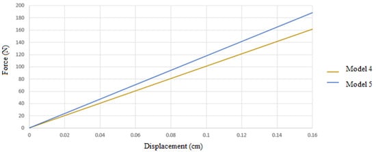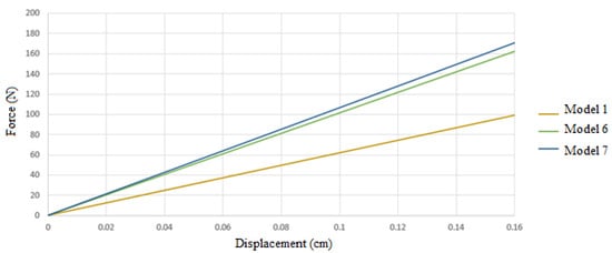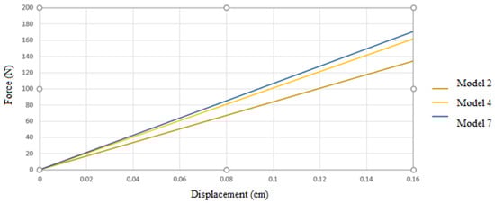 With a digging height of 80 cm and a horizontal displacement of the wall equal to 0.002 times that height, the allowable displacement is determined to be 0.16 cm. In order to establish the bearing capacity of the models according to the permissible displacement authorized by laws, it is essential to identify the force value that causes this displacement in the models, as seen in Figure 7.