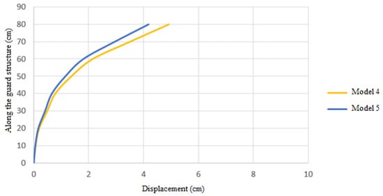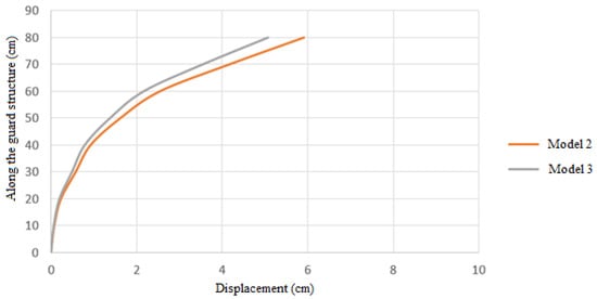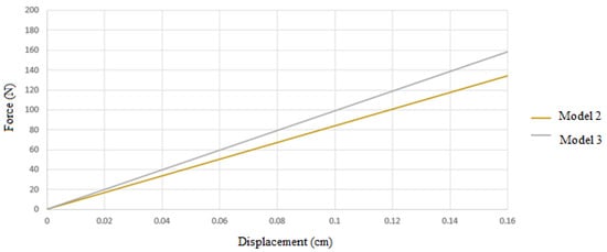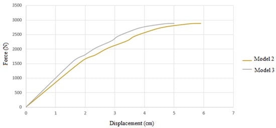 The permitted displacement is computed as 0.16 cm, taking into account that the wall’s horizontal displacement is equal to 0.002 of the digging height and that the digging height is 80 cm (according to Figure 19). Therefore, based on the permitted displacement of the regulations, it is possible to compute the bearing capacity of the models by obtaining the amount of force that generates this displacement in the models.