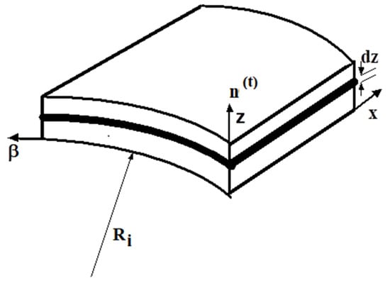Referring to Figure 1 and invoking the theory of parallel surfaces, the coefficients of the first fundamental differential quadratic form of a surface inside a cylindrical shell can be written in terms of their bottom surface (inside wall) counterparts as follows [,,,,]: