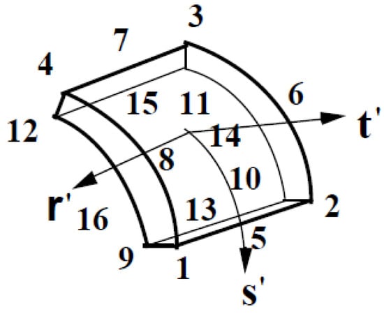 A 16-node curvilinear side surface-parallel quadratic isoparametric cylindrical shell element [,,,].