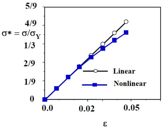 In what follows, a materials-only [] nonlinear three-dimensional cylindrical shell finite element analysis is presented in order to obtain the discretized system of equations. A cylindrically curved 16-node isoparametric element is employed, which is based on an assumed quadratic displacement field (in surface-parallel coordinates) and the assumption of linear distribution of displacements through thickness (LDT) [,]. The effect of initial small-scale material nonlinearity (assumed hypo-elastic) on the pre-buckling as well as the pre-yield response of a metallic (plane strain) ring is thoroughly investigated. Results relating to the extension to the same effect on the deformation and through-thickness stress distribution in the pre-buckling regime of a long asymmetric cross-ply cylindrical shell (plane strain ring) are deferred to a future date. Finally, physically meaningful conclusions are drawn from these numerical results.