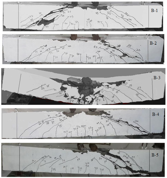 Figure 2 provides images of the examined beams that demonstrate typically observable fracture patterns and modes of failure. Except for the tested beam, B-3, which failed in a compression region in the middle of the spans prior to a shear failure, all of the examined RPC beams failed under shear.