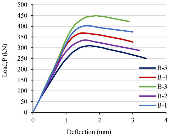 The ultimate strength (Pu,exp) and diagonal cracking strength (Pcr) of the examined beams in this study are shown in Table 4. Following the development of flexural fractures in the middle of the span, diagonal cracks often developed in the beam’s two shear spans. The breadth of the flexural crack narrowed significantly after the formation of diagonal shear cracks. Typically, a diagonal shear crack began abruptly in the center of the span of a shear crack and spread toward the supports and load points as a result of an increase in the load being applied. The already-present diagonal shear cracks only slightly spread further as the load applied was increased, but a few new inclined cracks were also created. Finally, the concrete fractured abruptly across the inclined crack due to shear failure. The images demonstrate that the shear spans of the examined beams B-1, B-2, B-4, and B-5 failed due to significant concrete degradation, whereas beam B-3 fell due to crushing of the compression zone in the middle of the span with an a/d of 3.0. According to the test results, flexural failure may occur before shear failure when minimal reinforcement for shear is provided within the distance of 0.5d recommended in ACI code [34]. The yielding of shear reinforcement, however, may be seen before the yielding of flexural reinforcement and the compression failure of beams with a distance that is higher than the minimal levels required by code.