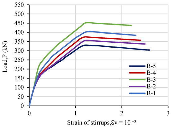 Relationship between the examined beams’ total load and strain in the stirrups’ vertical legs.