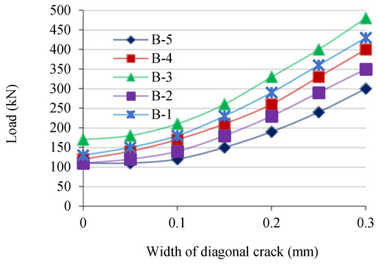 Table 4 and Figure 5 show the impact of the given vertical reinforcements in terms of the web ratio (ρv%) on the examined beams’ ultimate shear strength and the strength of diagonal cracks in terms of the distance between stirrups and the diameter of the stirrups’ bars. It is evident that while diagonal cracks formed more slowly with a smaller distance between stirrups (sv), they formed more quickly with a smaller diameter of the stirrup bars (dv). The growth of diagonal cracks was significantly slower for beam B-1, with a 100 mm stirrup spacing (sv), than it was for the comparable B-2 beam, with a 200 mm stirrup spacing (sv). The emergence of diagonal cracking occurred more slowly in beam B-4, with an 8 mm stirrup bar diameter and a 200 mm stirrup spacing (sv), than in beam B-2, with a 6 mm stirrup bar diameter and a 200 mm stirrup spacing (sv). As can be observed, decreasing the distance between stirrups had a greater inhibitory effect on the growth of diagonal cracks than increasing stirrup diameter. The given stirrup spacings (sv) for all the examined RPC beams are noticeably greater than the maximum stirrup spacing (sv,max) stipulated in the ACI code [34]. The RPC beams strengthened using the widest possible stirrup spacing, however, exhibited good overall performance.