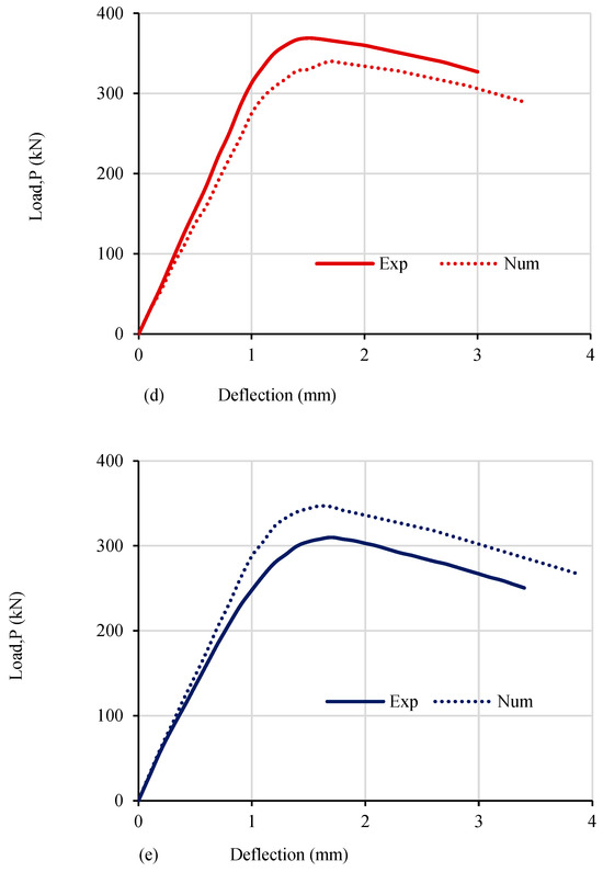 Comparison of the load–displacement curves for the examined beams using experimental and numerical data for (a) B-1, (b) B-2, (c) B-3, (d) B-4, and (e) B-5.