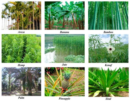 The global population is growing, as are living standards. Consequently, consumption of energy, emissions of carbon, and production of waste have been increasing globally. In order to find an alternative, numerous researchers have decided to replace or supplement the use of cementitious materials with a natural fiber. Biobased materials (sugar palm, pineapple, hemp, jute, kenaf, areca, banana, bamboo, sisal) that are frequently used in construction are shown in Figure 3.
