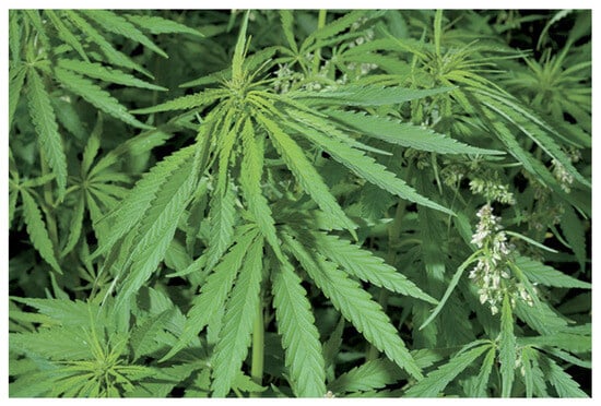 The plant is estimated to have around 25,000 useful usages [29,30]. Its use is steadily increasing in many areas, such as the textile industry, construction, paper, etc. Hemp (Cannabis Sativa) is an annual plant with palmate leaves grown for its stalk. Hemp cultivation provides two materials used in civil engineering. After drying and mechanical treatment (defibration or scutching), the stalk is broken down into hemp shives, the granular form of hemp (65–70% of the stalk mass), and filasse or tow, the fibrous form of hemp (30–35% of the stalk mass) [31]. Figure 4 shows the hemp plant in the wild.