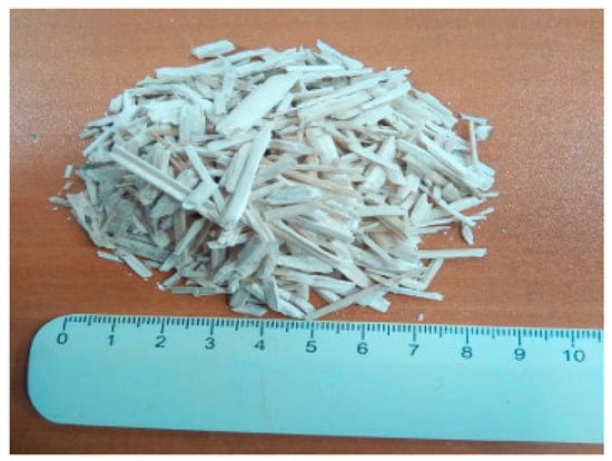 Many studies have been carried out on hemp shives [40,41,42,43,44,45,46] that can be applied to biobased building materials like hemp concrete [41,47,48]. This insulated material is formed from hemp shives mixed with a binder (lime) and water [49]. Life-cycle assessment of hemp concrete has demonstrated a low carbon footprint and low embodied energy. In addition, researchers [35,41,49,50] have shown that both hemp panels and hemp concrete offer a good insulating material with highly promising physical and hygrothermal properties. Its porous structure and lower density decrease thermal conductivity down to 0.1 W/(mK) in comparison to traditional materials like Portland cement concrete, bricks, and blocks. The overall thermal conductivity of building materials improves with a rising binder ratio. Figure 5 shows hemp shives in bulk with a maximum diameter of 1 cm. The chemical properties of hemp shives are shown in Table 3. The mechanical, thermal, and hydric properties of hemp shives are shown in Table 4.