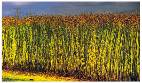 Flax (Linum usitatissimum) is a member of the Linaceae family and of the Linum genus, which comprises over two hundred species [57]. The most widespread flax plant is called Linum usitatissimum. The plant consists of a stem and a small blue flower at its end. It possesses extended fibers running through its entire length, contributing to its stiffness. Flax plants thriving in the wild are shown in Figure 6.