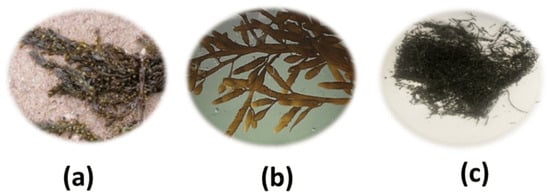 Sargassum muticum. (a) Collection; (b) washing; and (c) drying, with color change [27].