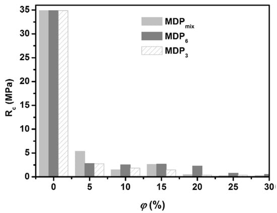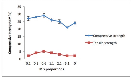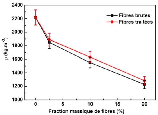 The density of hemp-based concretes varies according to several factors, such as the proportions of the ingredients used and the manufacturing method. The specific gravity of hemp shives is considerably less than that of standard aggregate concrete. This means that hemp concrete has a much lower density than ordinary concrete. Conventional concrete most probably has a density of 2200–2400 kg/m3. Normal concrete is a lightweight product with a density of approximately 200 to 600 kg/m3, according to [87]. Figure 10 shows the variation in volumetric mass with respect to the mass percentages of added fibers.