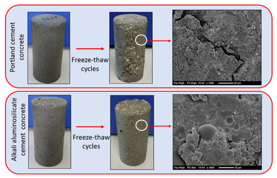 - Matalkah, F.; Soroushian, P. Freeze thaw and deicer salt scaling resistance of concrete prepared with alkali aluminosilicate cement. Constr. Build. Mater. 2018, 163, 200–213. [Google Scholar] [CrossRef]