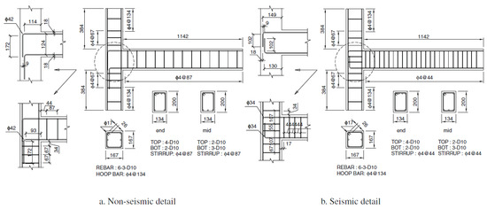 In recent years, many details of the BCJs have been examined to protect the BCJs from failure during seismic vibration. In this regard, impacts of several critical factors, such as the degree of steel reinforcement in various types of concretes [15], changes in the longitudinal reinforcement [16] and shear reinforcement [17,18,19,20], and the use of rebar at different diameters [21] on the BCJs were evaluated. It is established that diverse strengthening methods, like the incorporation of different carbon fiber sheets (CFRP and glass fiber-reinforced polymer (GFRP)) [22,23,24], steel plate jacketing [25], and external post-tension rods [26], can effectively be used to improve the anti-seismic behavior of BCJs. The results of several experimental and theoretical studies on the BCJs concerning influencing factors and strengthening methods have significantly contributed towards their anti-seismic performance.