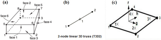 Elements used in ABAQUS to model: (a) C3D8R for concrete, (b) T3D2 for longitudinal and transverse reinforcement, and (c) the S4R5 four-node shell for FRP.