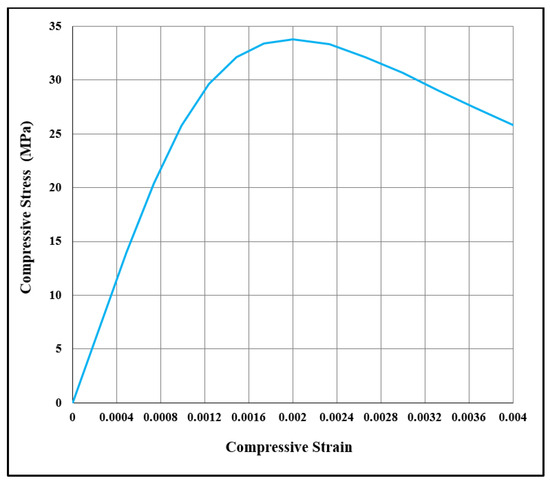The damaged plasticity model in ABAQUS is characterized by the degradation of the compression and tension. When plasticizers are introduced, the elastic stiffness of the material decreases due to its deterioration, making it unable to restore the original elastic stiffness. This is crucial for cyclic loading, as the two damage parameters are considered to be dependent on the plastic strains, indicating a reduction in the elastic stiffness. Figure 5 displays the stress–strain curve for tension and compression modeled using the damage plasticity model.