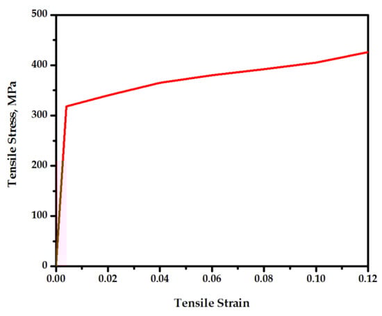 The linear isotropic and bilinear kinematic model was applied to simulate the elastic and inelastic behavior of the steel components in the reinforcement bar. The material model in ABAQUS used the Young’s modulus value of 200,000 MPa and Poisson’s ratio of 0.3 to accurately represent the behavior of steel. Following the tensile test conducted by Trung [58], the steel material parameters utilized in the finite element models were derived. These properties were then incorporated into the model (Table 2 and Figure 7). An orthotropic elastic material was used to represent CFRPCs. Following the report of Narayanan [65], the material properties were determined. The required material properties for the 3D analysis of CFRP are displayed in Table 1. The model assumed full bonding between CFRP and concrete.