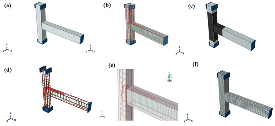 3D finite element model for the analysis of NSCBCJ- and CFRPC-integrated NSCBCJs. (a) NSCBCJ specimen, (b) seismic specimen, (c) one and two layers of the CFRPC specimen, (d) longitudinal and transverse reinforcement of the NSCBCJ specimen, (e) longitudinal and transverse reinforcement of the seismic specimen, and (f) mesh of all models.