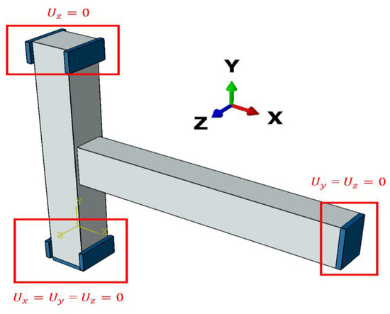 The loads and limitations applied in the finite element models were identical to the conducted test. In addition, the lateral cyclic loading was carried out at each drift ratio in the finite element models. Herein, UX, UY, and UZ are the displacement in the direction of x (beam axis), y (column axis), and z (displacement perpendicular to the x and y axis) axis, respectively. The z-direction displacements were completely restrained at the top of the column (Uz = 0) and the lateral displacements were applied in the x-axis direction. To simulate the hinge support, the displacements in the column bottom at each direction were restrained (Ux = Uy = Uz = 0). Additionally, the displacements in the y and z directions were restricted (Uy = Uz = 0) at the end of the beam to indicate roller support. Figure 9 shows the boundary condition used in finite element analysis.