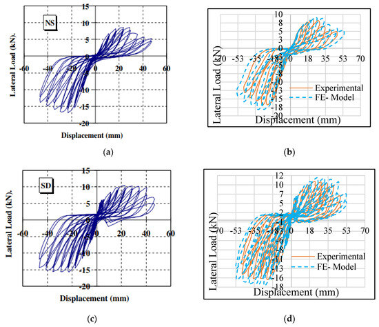 The results of the finite element studies showed that a total of 30 cycles at 12 different drift levels varied from 0 to 10% applied to the specimens. The compression axial load on the column was not considered based on the experimental work. The total deformations that occurred near the top end of the columns were measured with a Linear Variable Differential Transformer as mentioned by Trung [58]. The hysteretic curves were initially linear and elastic. With the increase in displacement, the specimens were converted into an inelastic response due to the occurrence of pinch effects. The experimental and finite element results proved that the NSCBJ specimens were strengthened due to the integration of CFRPCs, displaying a good seismic behavior with endurance strength at the test end. In short, the specimens showed maximum lateral strength and no crushing of the concrete occurred. In addition, the observed difference in the main reinforcement bar that caused the force–displacement curves was different in the positive and negative direction of loading therefore it differed in the lateral resistance of the peaks.