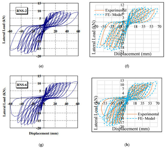 Comparison force–displacement curves for the non-seismic specimen (NS), seismic specimen (SD), strengthened one-layer CFRPC specimen, and strengthened two-layer CFRPC specimen. (a) Experimental results of Trung [58] on NSCBCJ; (b) comparison of the proposed model results with experiments with NSCBCJ; (c) experimental results of Trung [58] with SD; (d) comparison of the proposed model results with experiments with SD; (e) experimental results of Trung [58] with one-layer CFRPC; (f) comparison of the proposed model results with experiments with one-layer CFRPC; (g) experimental results of Trung [58] on two-layer CFRPC; (h) comparison of the proposed model results with experiments of two-layer CFRPC.