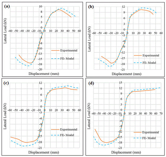 To confirm the viability of the simulated finite element models, the force–displacement curves of four specimens obtained in the current study were compared with the experimental findings of Trung [58] as shown in Figure 10. The finite element results were observed to be consistent with the experimental ones (Table 3). It was asserted that the simulated finite element model is able to predict the inelastic response of the test specimens. The observed slight difference between the finite element model simulations and experimental results may be due to (1) unexpected occurrences in the experimental work, (2) variables, like the concrete’s tensile and compressive properties selection, (3) the refinement of meshes, (4) the use of idealized boundary conditions in the finite element models, and (5) nonlinearity in the materials’ behavior (materials’ properties modeled in ABAQUS).