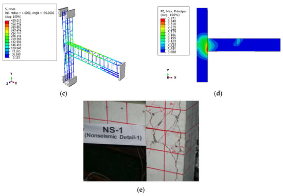 Finite element output of the NS beam–column joint. (a) Concrete tensile damage; (b) concrete compressive damage; (c) stress in the reinforcement; (d) FE crack pattern; (e) experimental crack pattern [58].