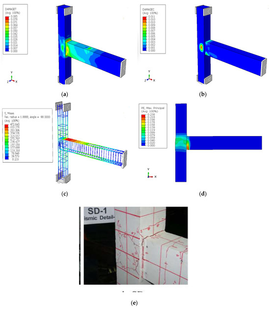 Figure 13a revealed that the SD beam–column suffered from beam tensile damage wherein the concrete’s tensile damage mostly spread in the beam. The yielding of the longitudinal bars occurred without yielding of the transverse joint bars (Figure 13c). In addition, the concrete’s damage developed in the joint. The failure of this specimen occurred due to cracking of the concrete beam. The principal plastic strain showed the formation of cracks in the beam which is very similar to the crack pattern obtained by the finite element model (Figure 14d).