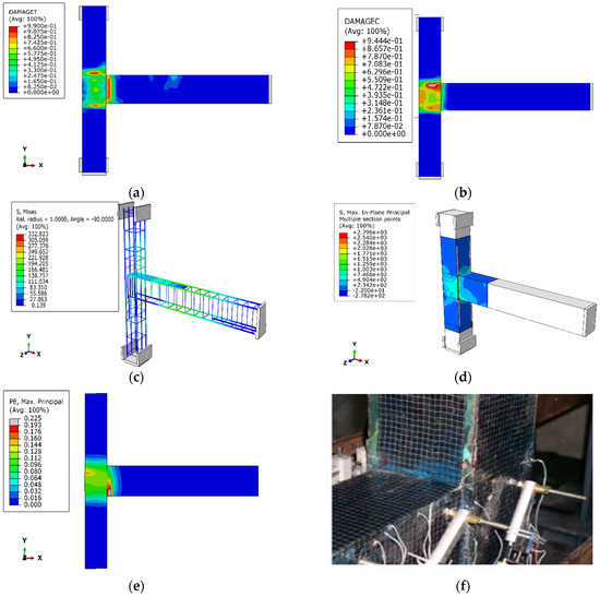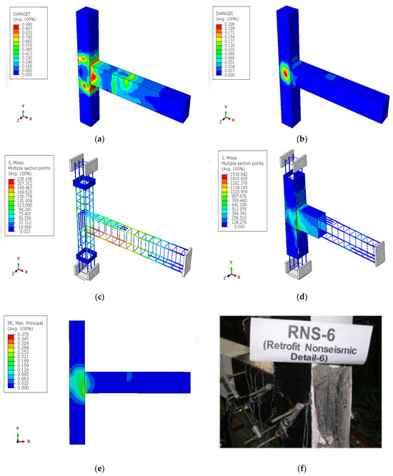Finite element output of the single-layer CFRPC-strengthened beam–column joint. (a) Concrete tensile damage; (b) concrete compressive damage; (c) stress in the reinforcement; (d) stress in the CFRP; (e) FE crack pattern; (f) experimental crack pattern [58].